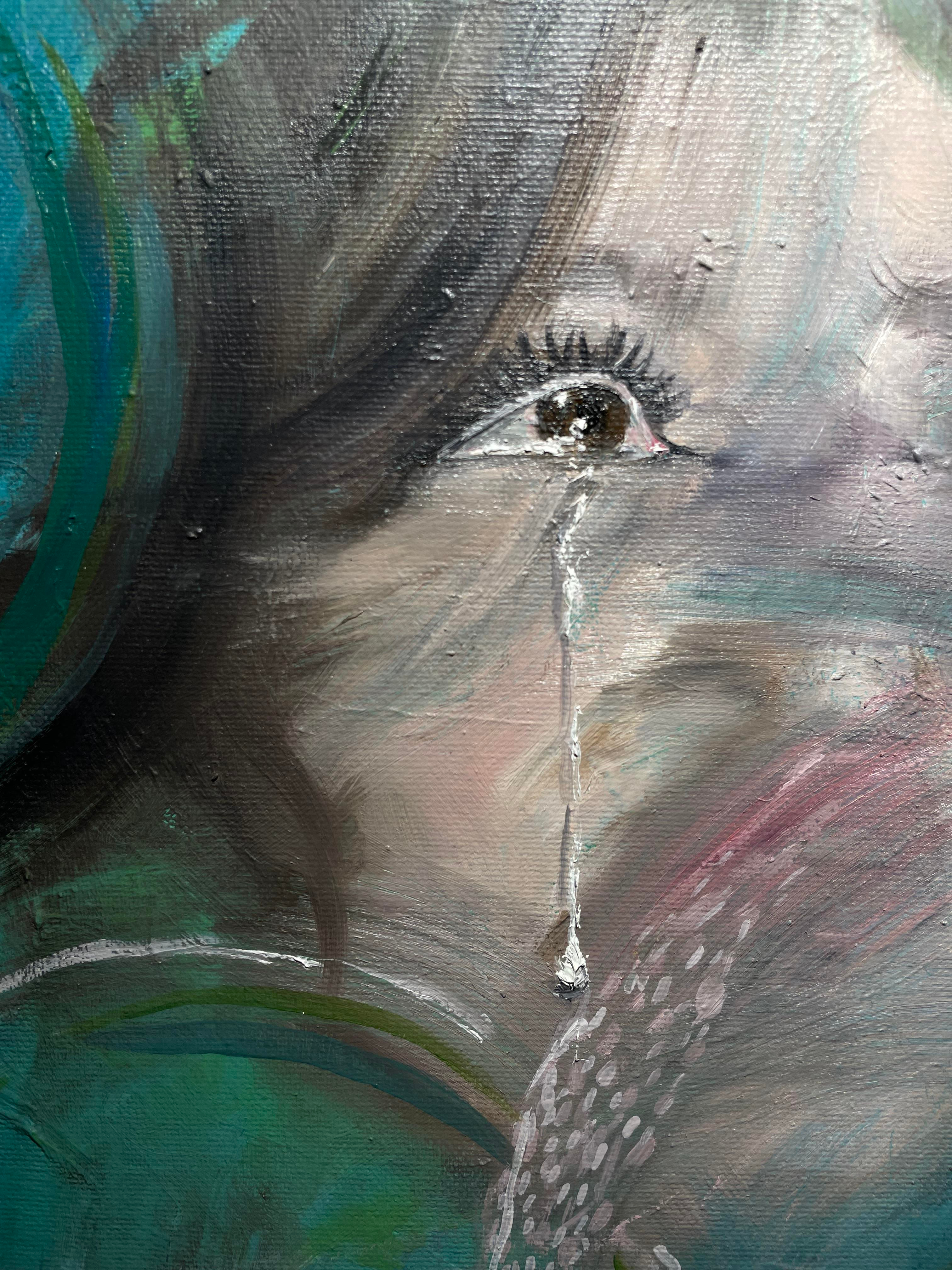 Through mixed media in acrylic and oil the work lets pigment blur like memory. Line loosens, edges soften, and the self becomes water held for a moment, then lost to the dark green depth.