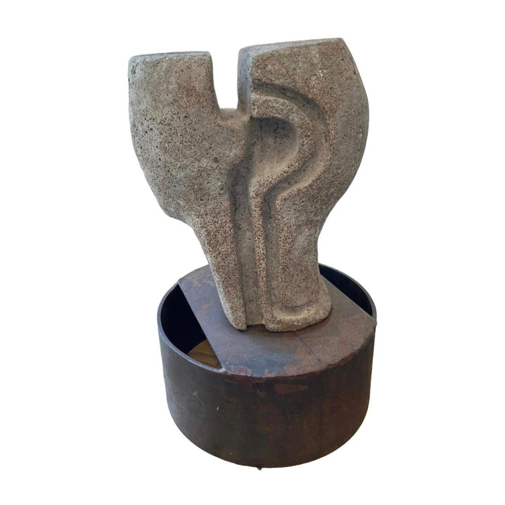 Composed of a hybrid concrete metal dust mixture and elevated on a solid metal base, the work embodies the friction between weight and weightlessness, rawness and refinement. This material duality deepens the conceptual resonance: a consciousness suspended between structure and dissolution.